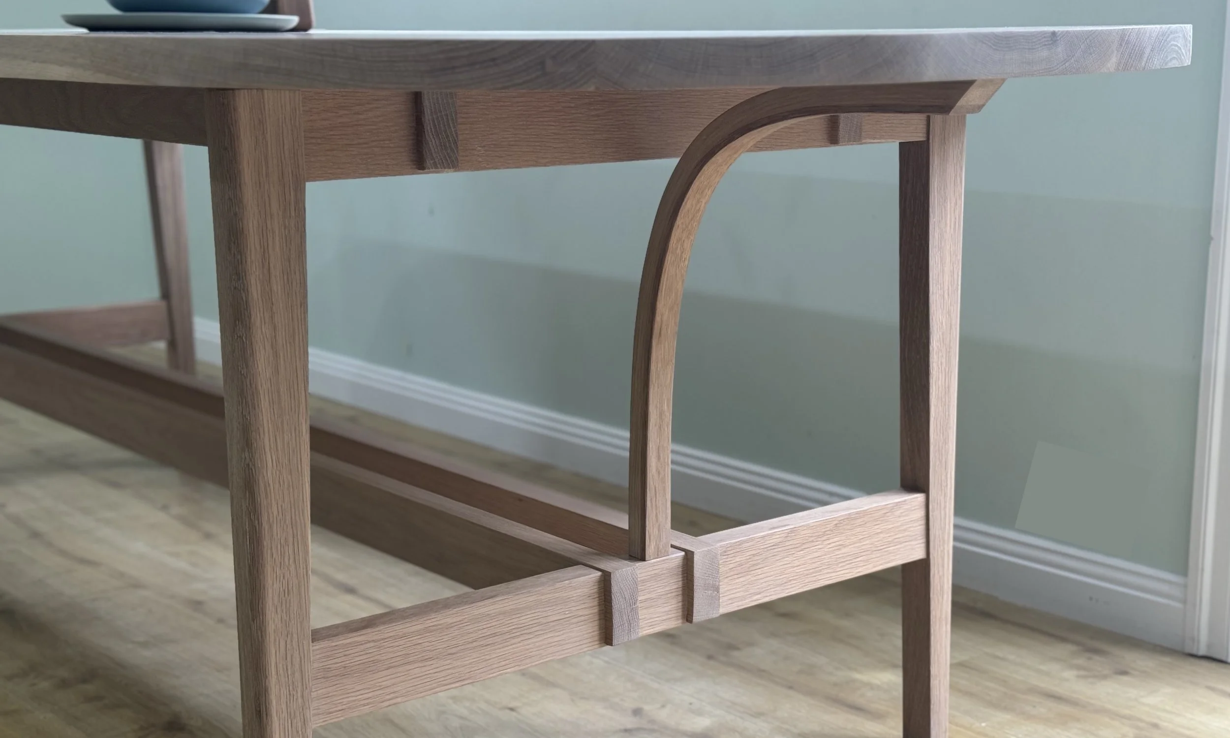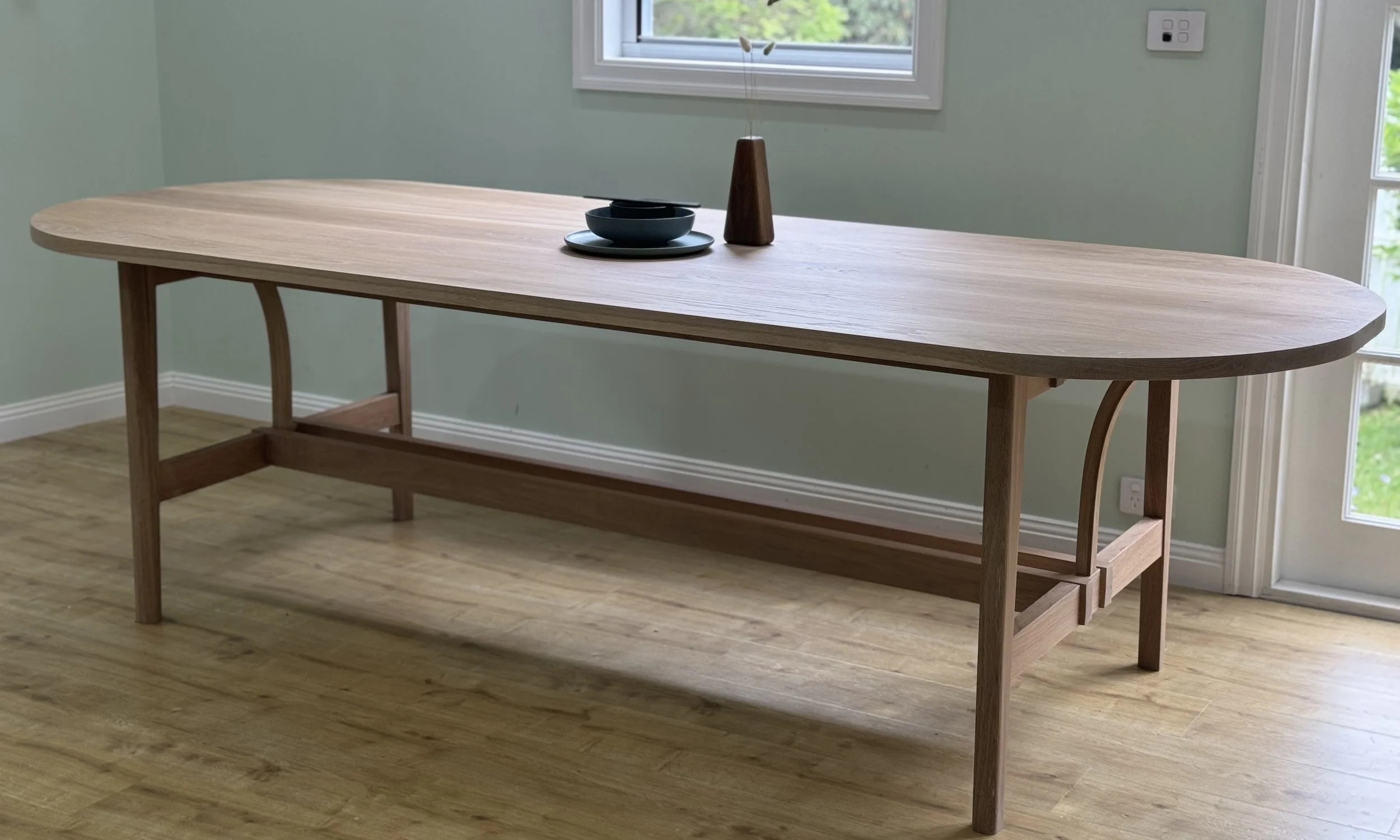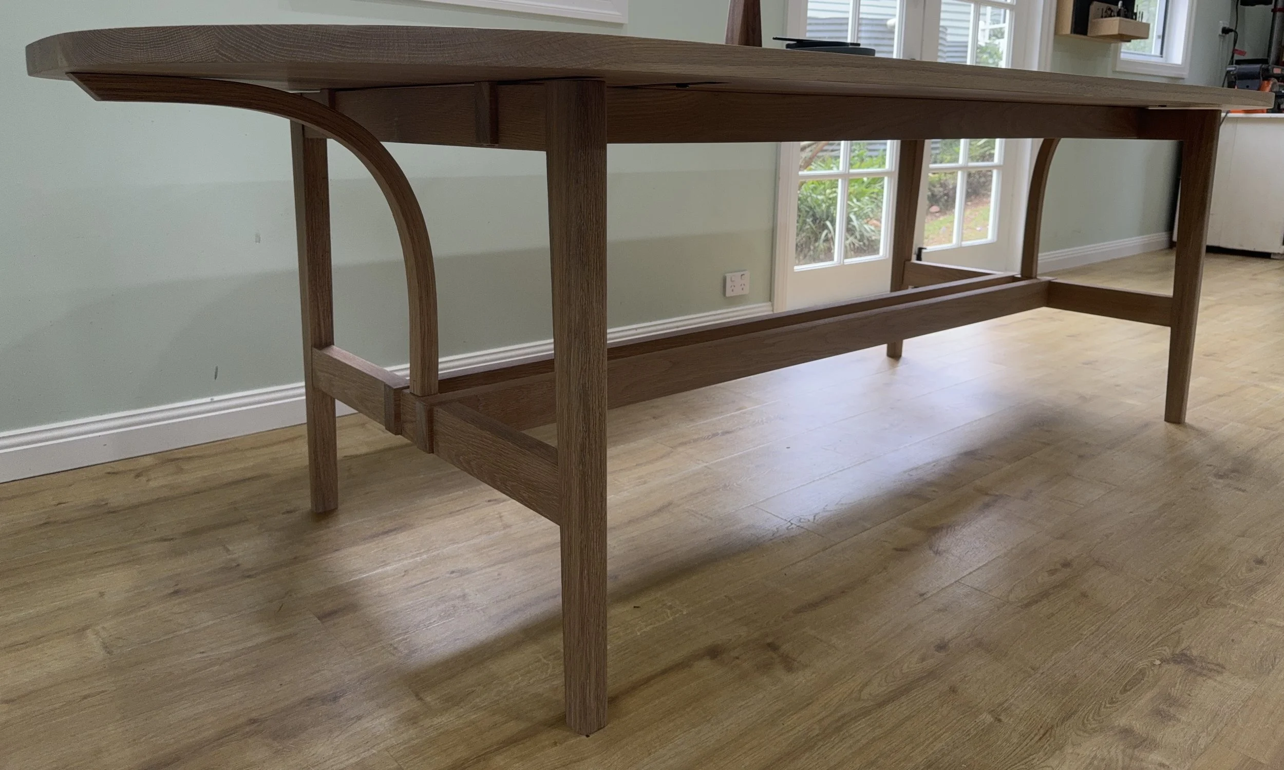 Original design with inspiration taken from Japanese form. Created and built in White Oak, this dining table displays beautiful curves that are soft to the touch and the eye. The design incorporates wood bending techniques that provides architectural style and engineered strength. Finished in a natural hard wax oil and built so that the table top is easily removed from the base for transport.