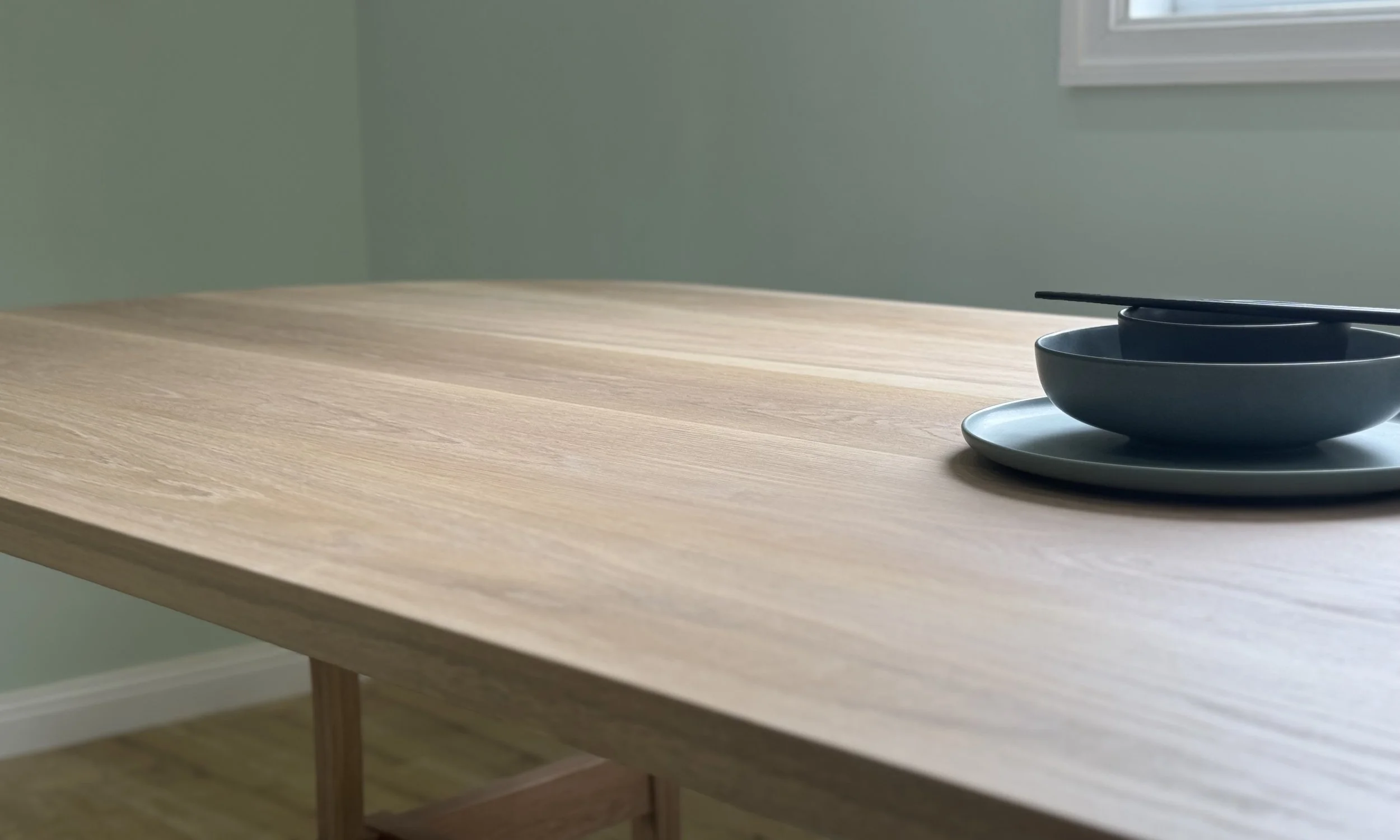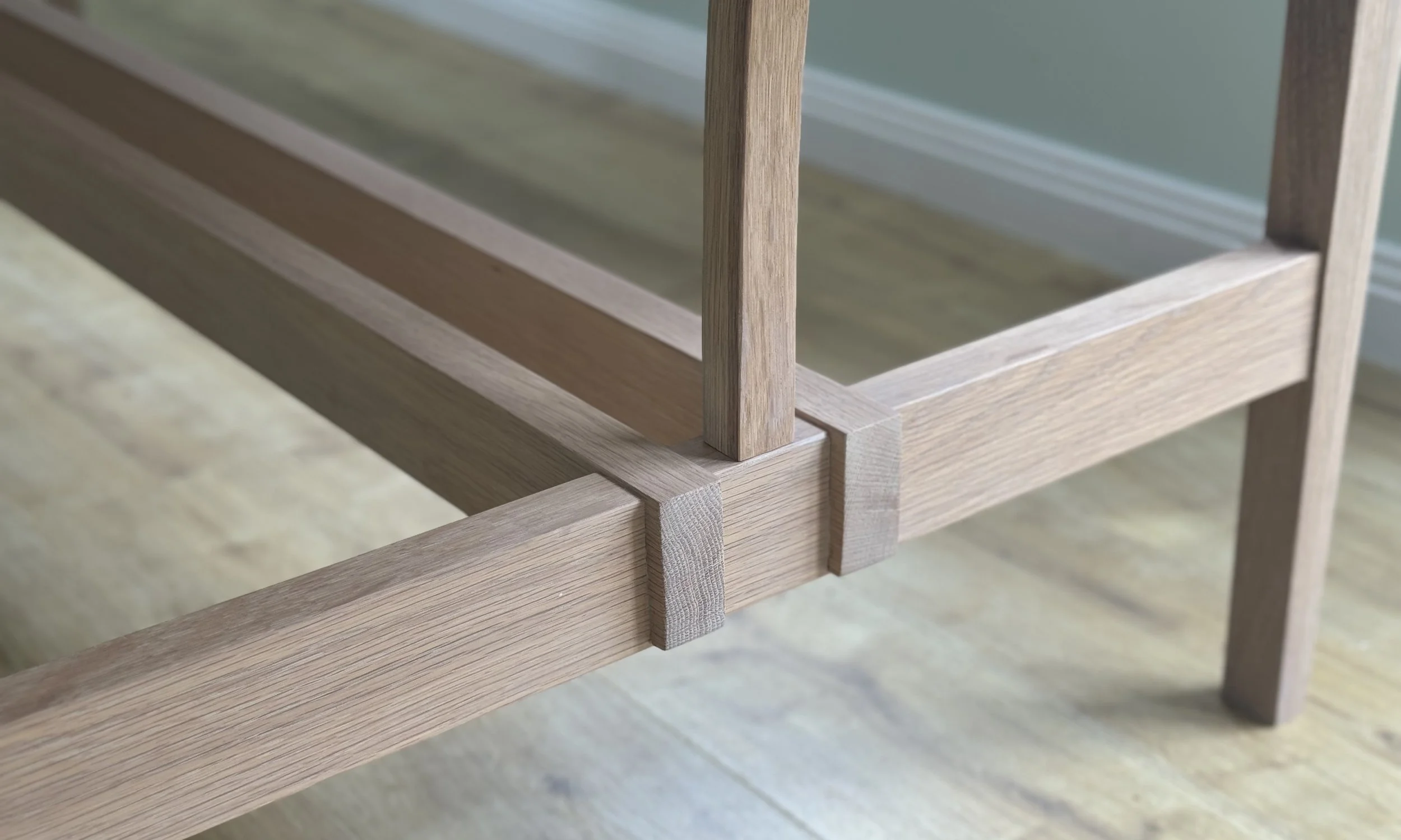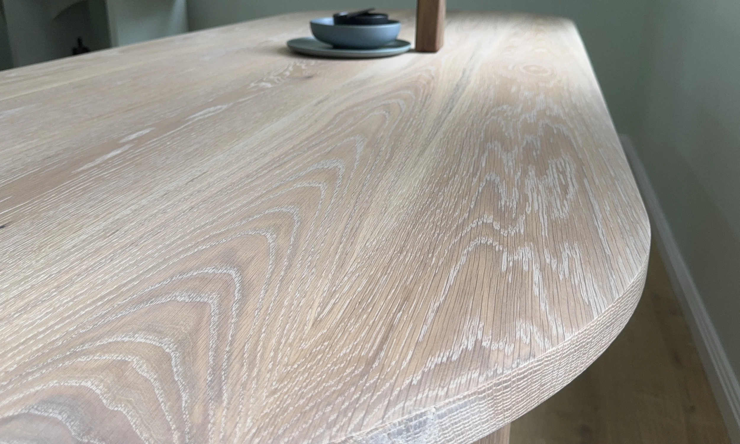 Original design with inspiration taken from Japanese form. Created and built in White Oak, this dining table displays beautiful curves that are soft to the touch and the eye. The design incorporates wood bending techniques that provides architectural style and engineered strength. Finished in a natural hard wax oil and built so that the table top is easily removed from the base for transport.