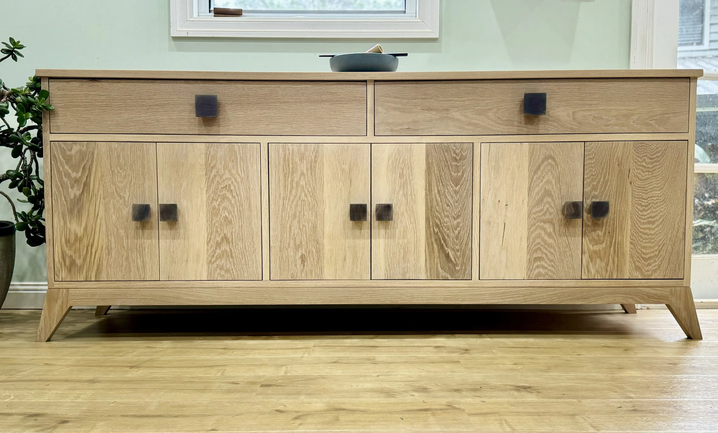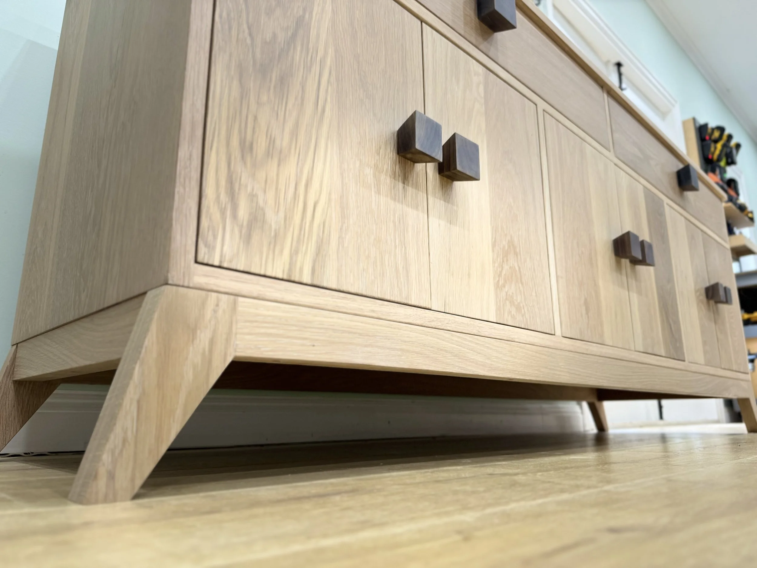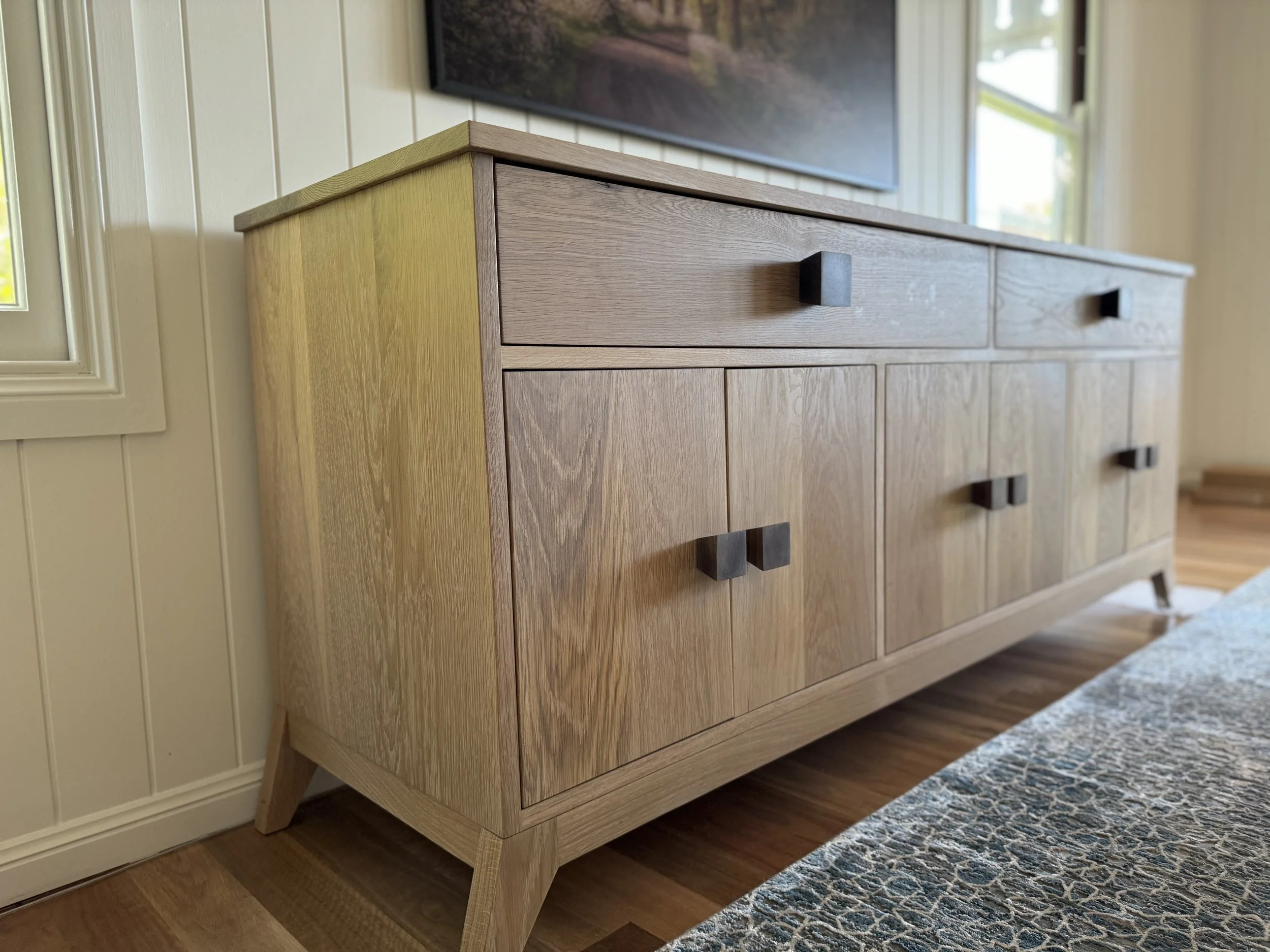 Bespoke simplicity in White Oak, with handmade Black Walnut handles. Designed to be a hero piece, front and centre in whatever room it lives. Soft close concealed hinges and soft close drawers make this luxury piece a pleasure to use with adjustable shelving inside three seperate storage areas. Two deep drawers complete the unit allowing for optimal storage options. Finished in Rubio Monocoat 'Natural' which is a hard wax oil allowing the true natural feel of the White Oak to come through.