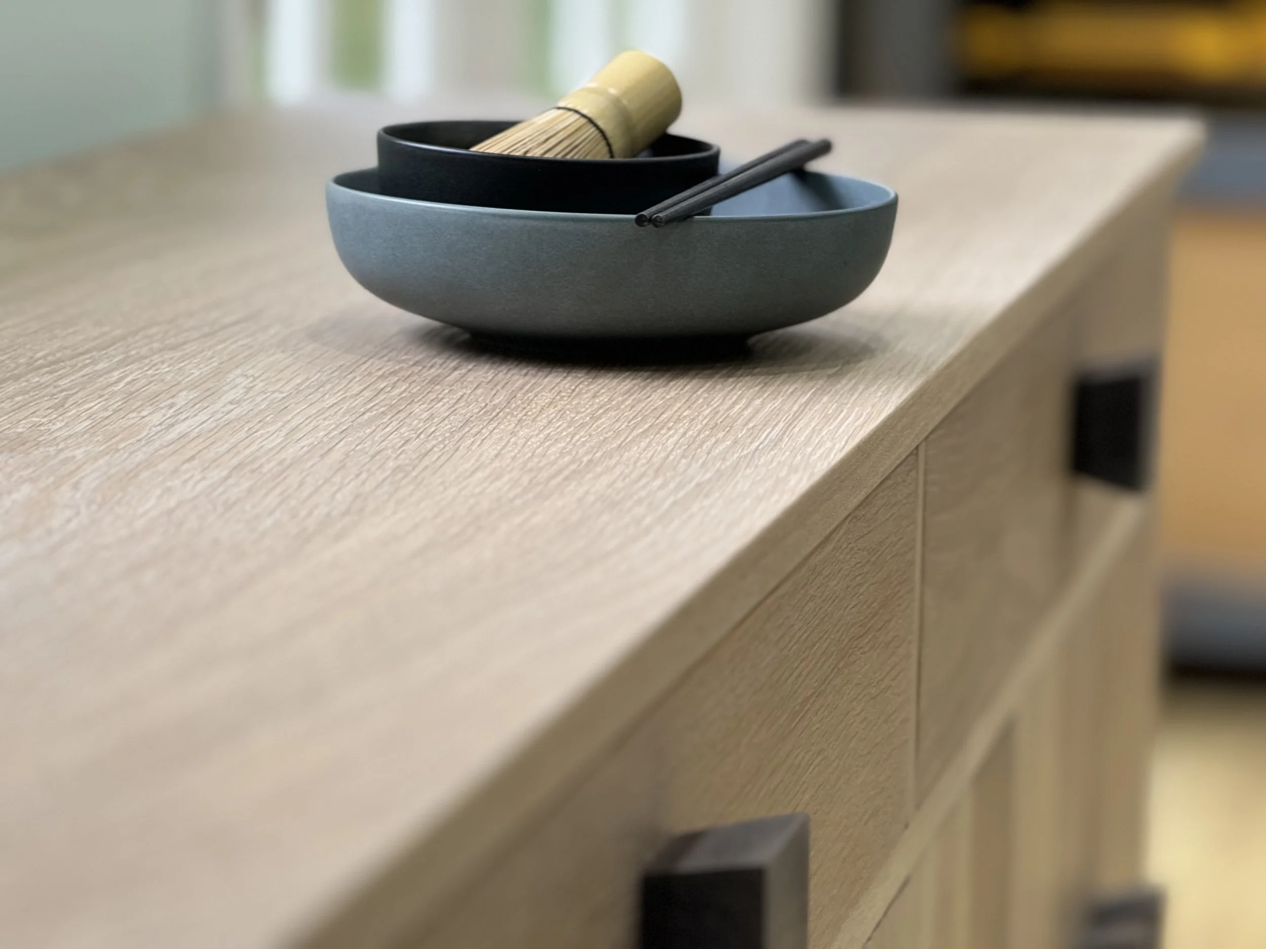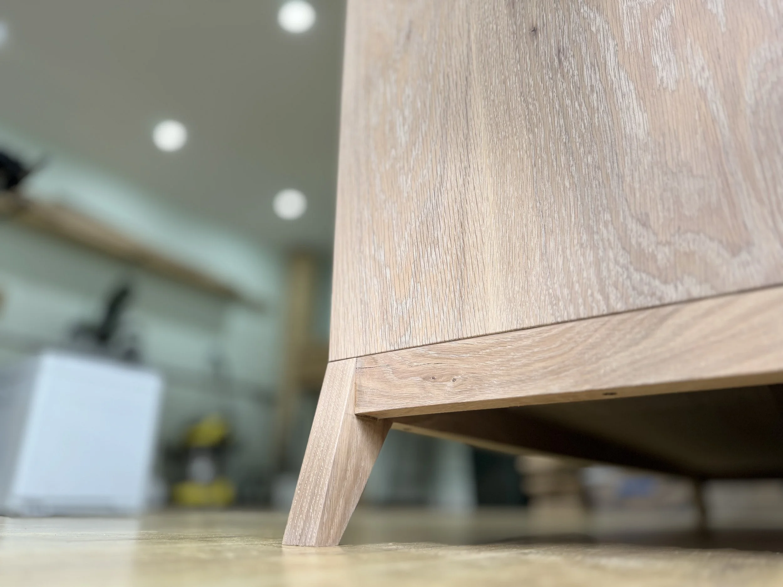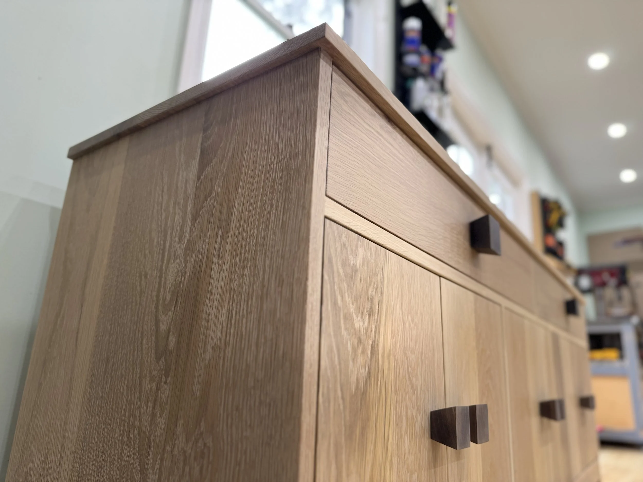 Bespoke simplicity in White Oak, with handmade Black Walnut handles. Designed to be a hero piece, front and centre in whatever room it lives. Soft close concealed hinges and soft close drawers make this luxury piece a pleasure to use with adjustable shelving inside three seperate storage areas. Two deep drawers complete the unit allowing for optimal storage options. Finished in Rubio Monocoat 'Natural' which is a hard wax oil allowing the true natural feel of the White Oak to come through.