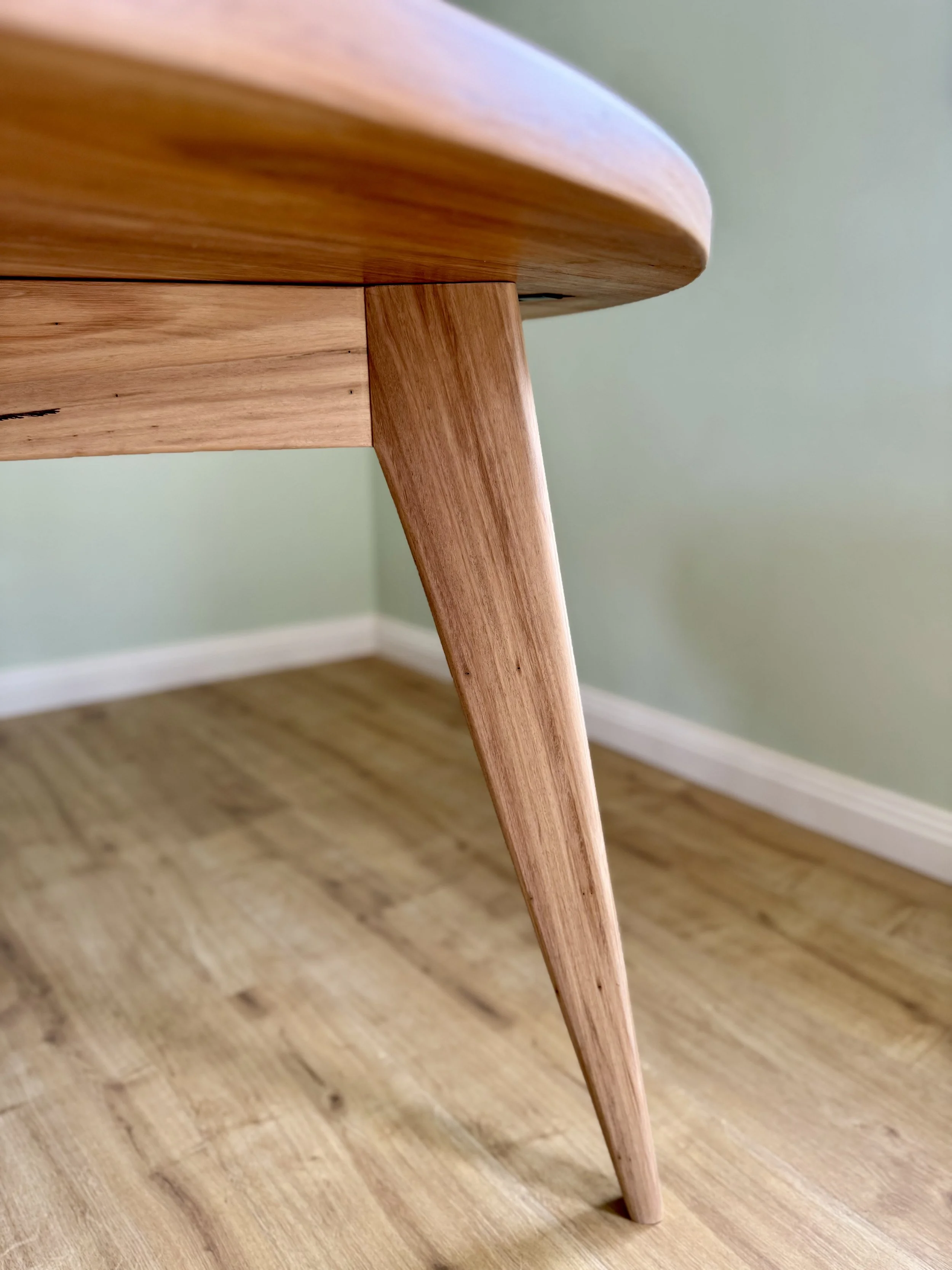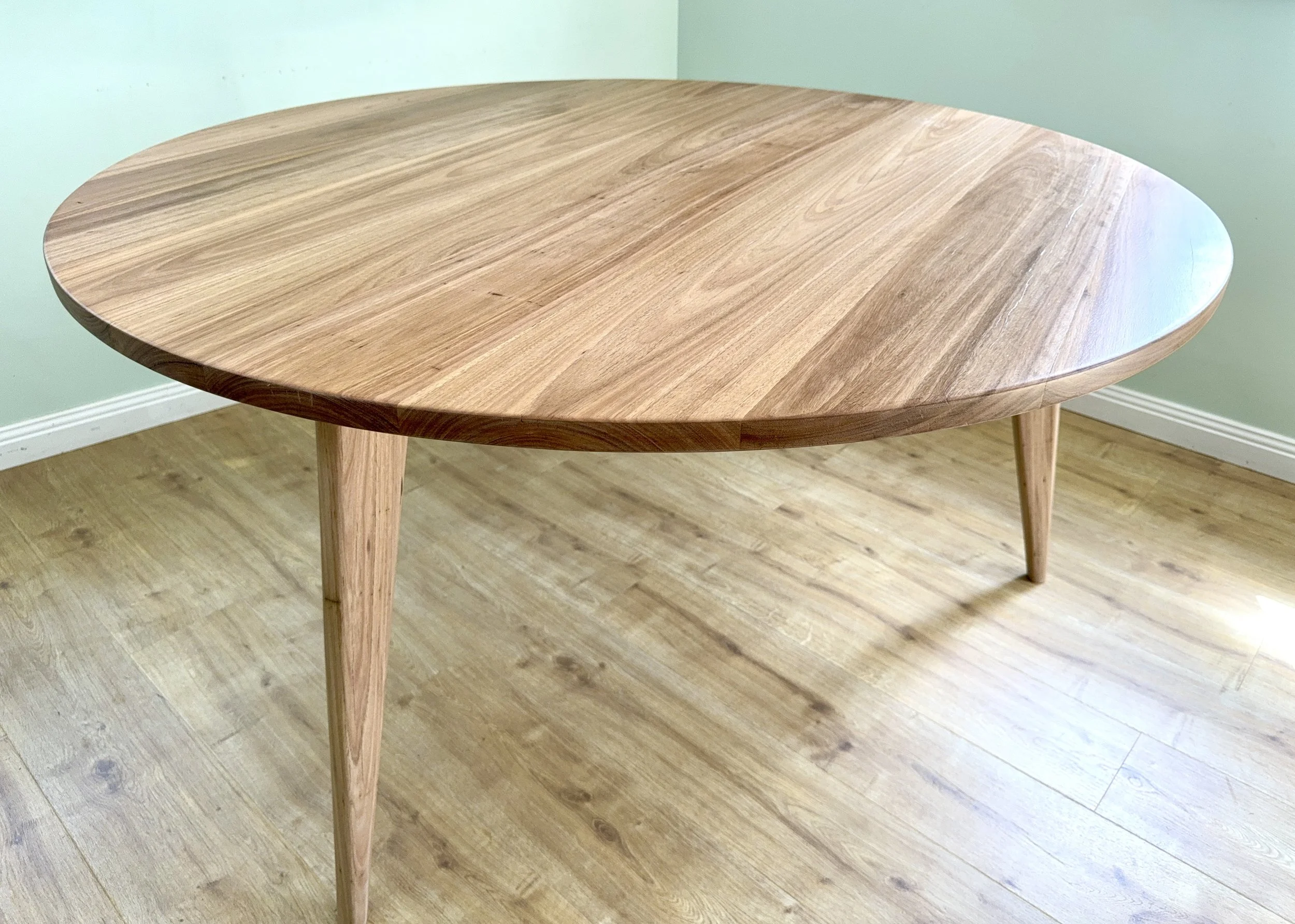 At 1500mm in diameter this 3-leg, 6 seater Dining table is built from reclaimed Australian Blackbutt and finished in an acrylic clear polyurethane. This table is engineered with the strength of 2 C-channel braces routed into the underside of the top to ensure there will never be warpage due to humidity and other weather change. With a broad stance that anchors it to the ground this table comfortably seats 6. Round tables are great to engage with family and friends as you enjoy each others company. Can also be made with white oak and walnut.