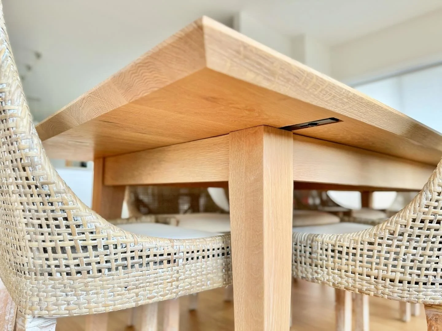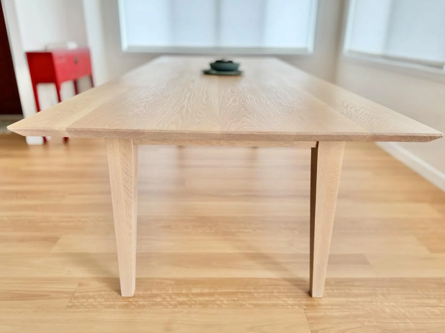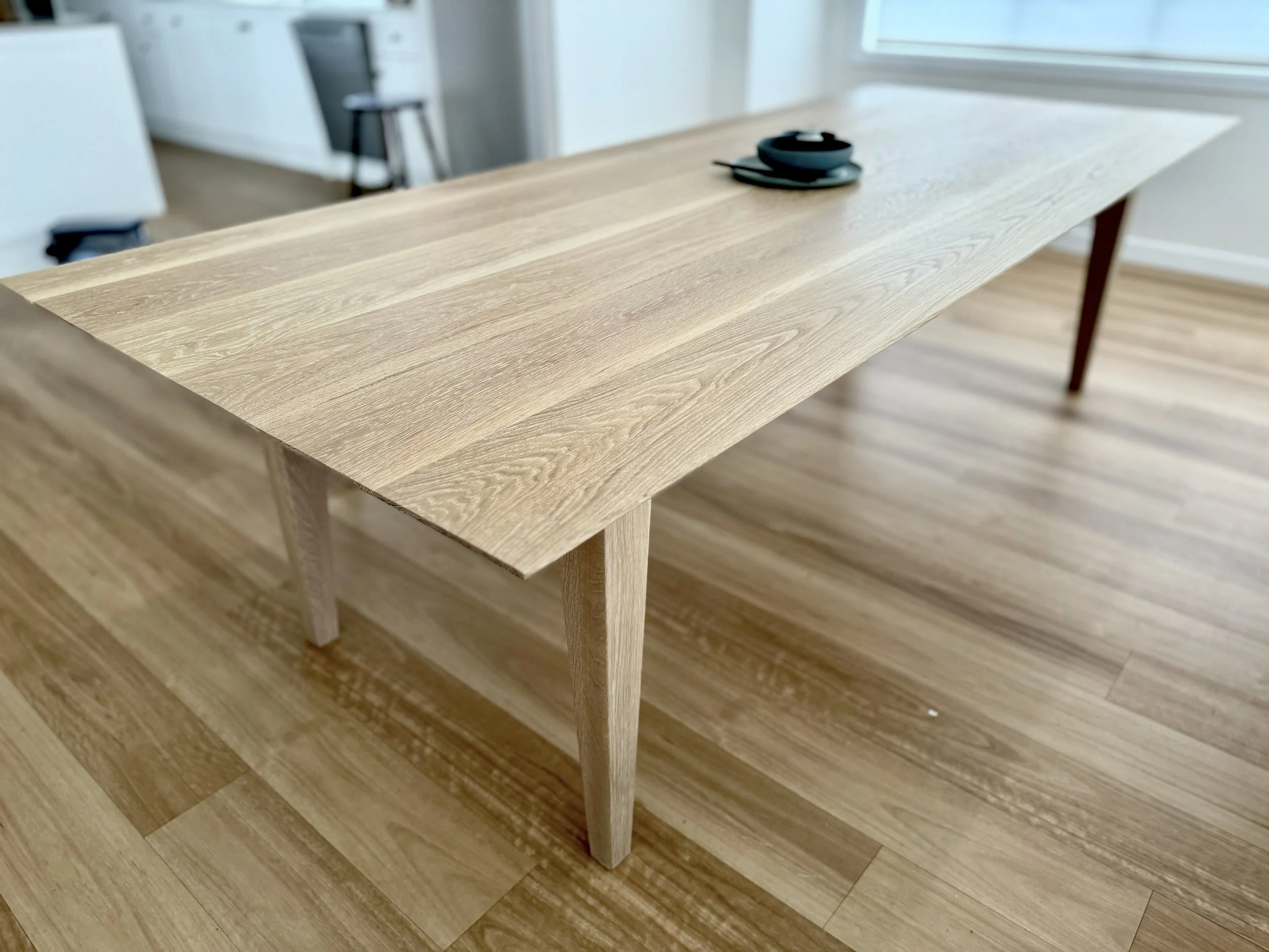 Built from American White Oak and measuring 2700 x 1100 x 760mm this dining table is the perfect entertainer. Finished in Rubio Monocoat Pure, it has been purpose designed with an oversized surrounding edge, allowing for every part of this classic table top to be utilised. Leg room is plentiful allowing this table to comfortably seat 10 people. A beautifully chamfered under bevel and subtle tapered legs make this understated piece a beautiful addition to any dining area. Finish sizes can be discussed during consultation.