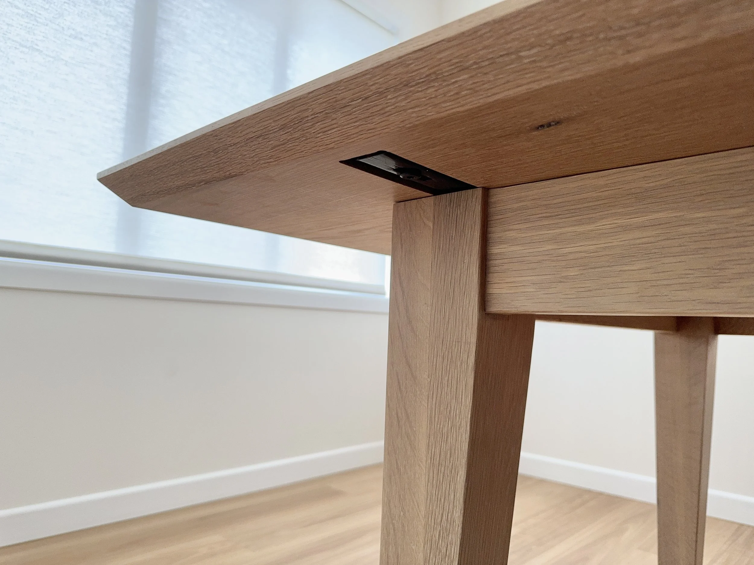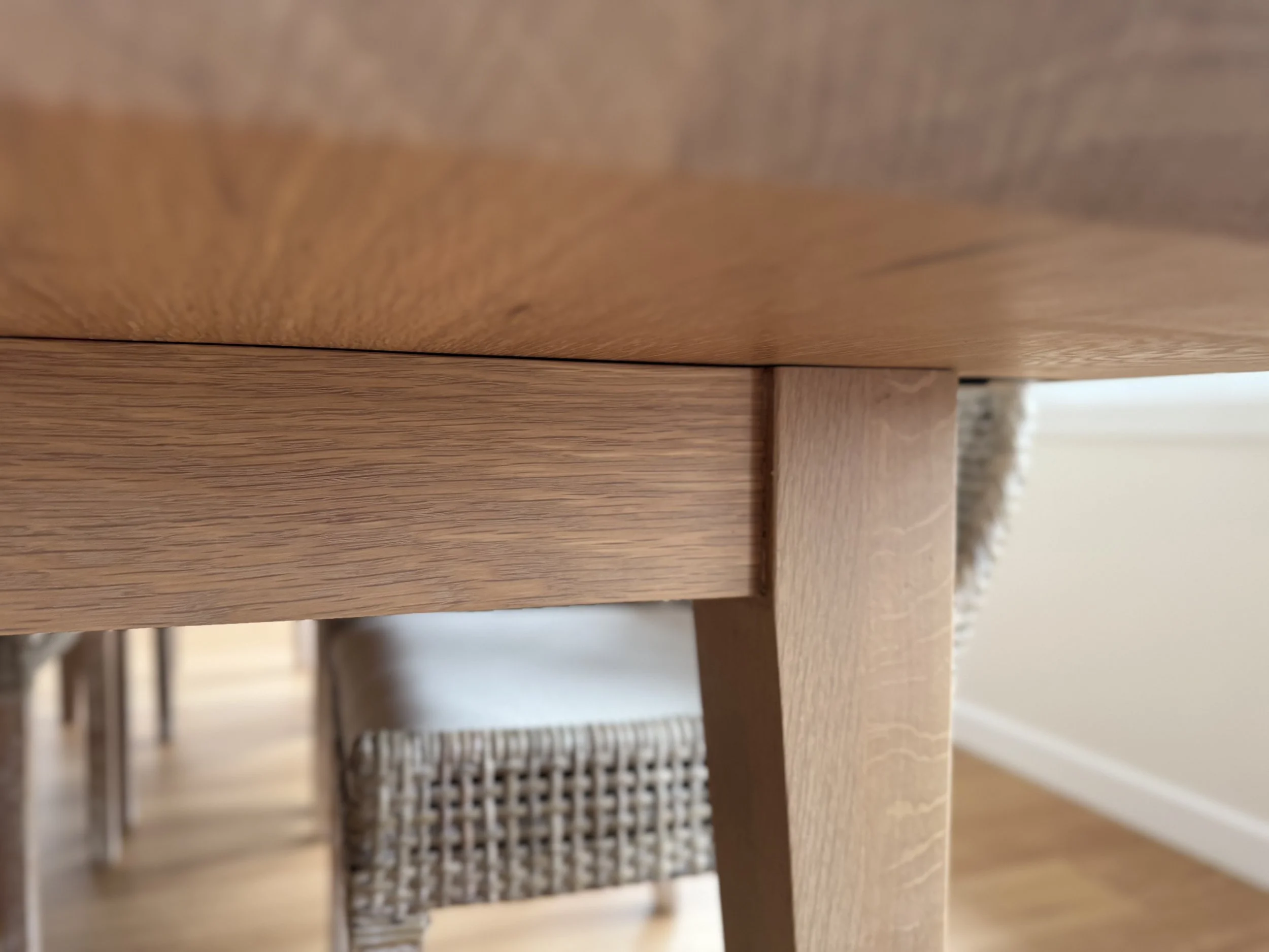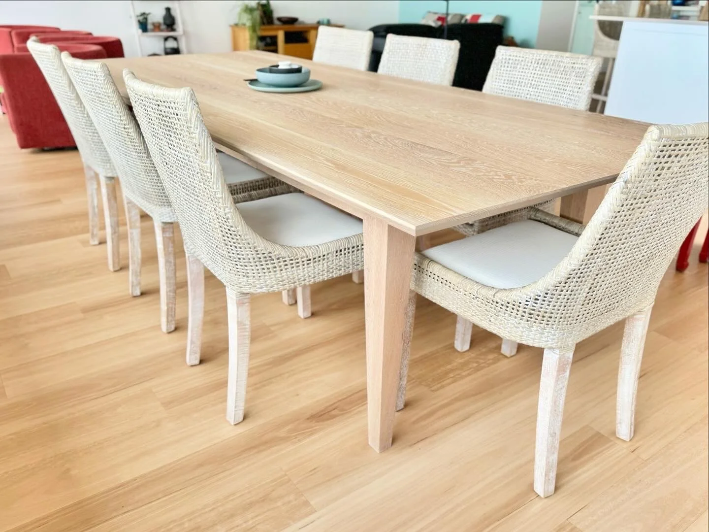 Built from American White Oak and measuring 2700 x 1100 x 760mm this dining table is the perfect entertainer. Finished in Rubio Monocoat Pure, it has been purpose designed with an oversized surrounding edge, allowing for every part of this classic table top to be utilised. Leg room is plentiful allowing this table to comfortably seat 10 people. A beautifully chamfered under bevel and subtle tapered legs make this understated piece a beautiful addition to any dining area. Finish sizes can be discussed during consultation.