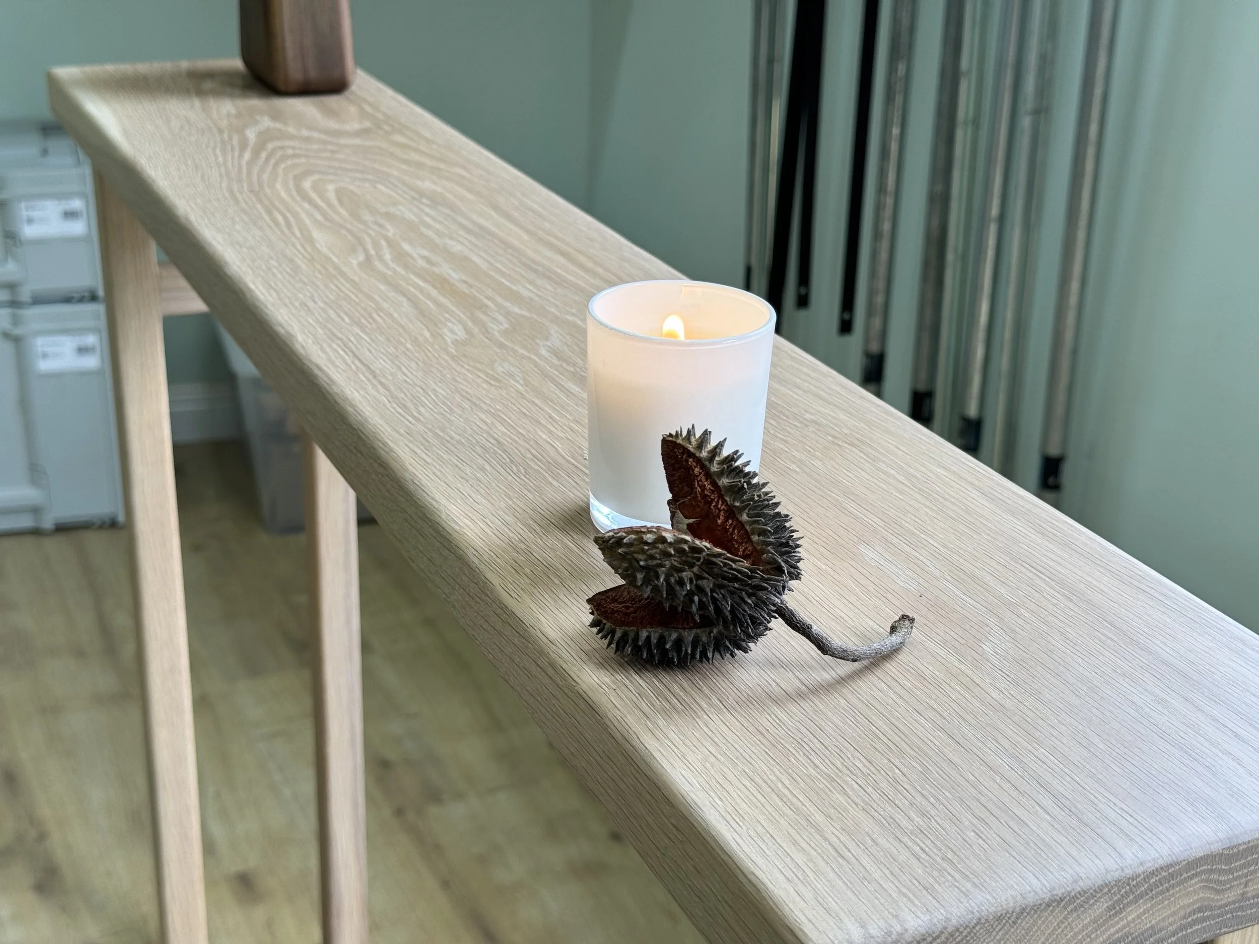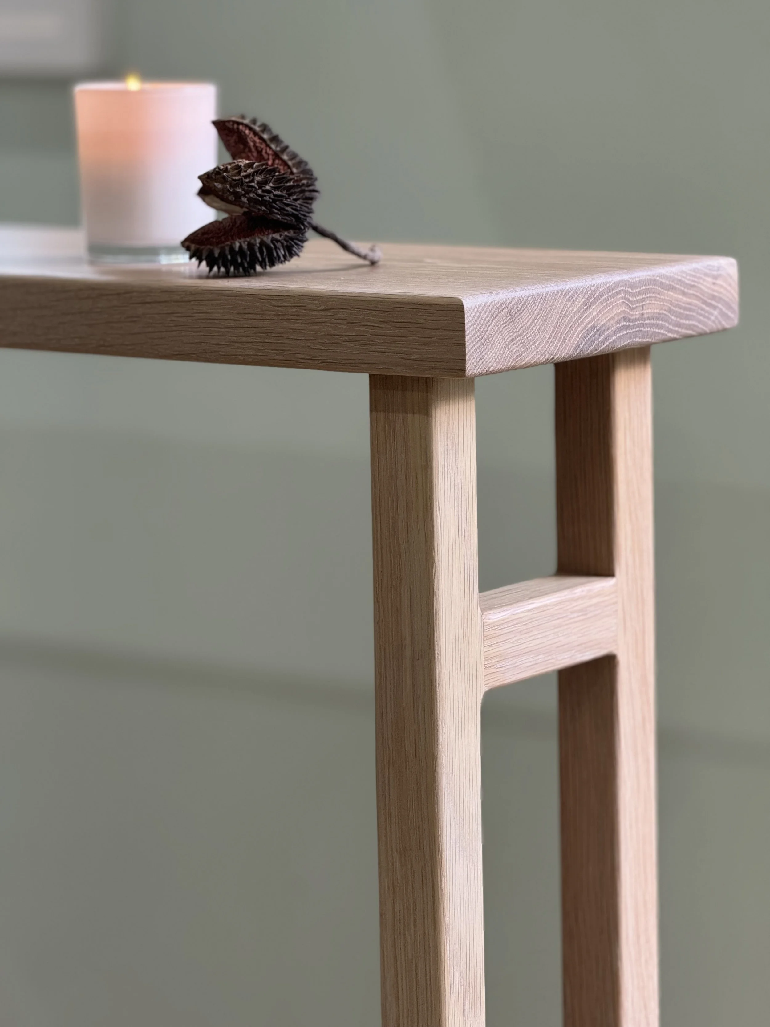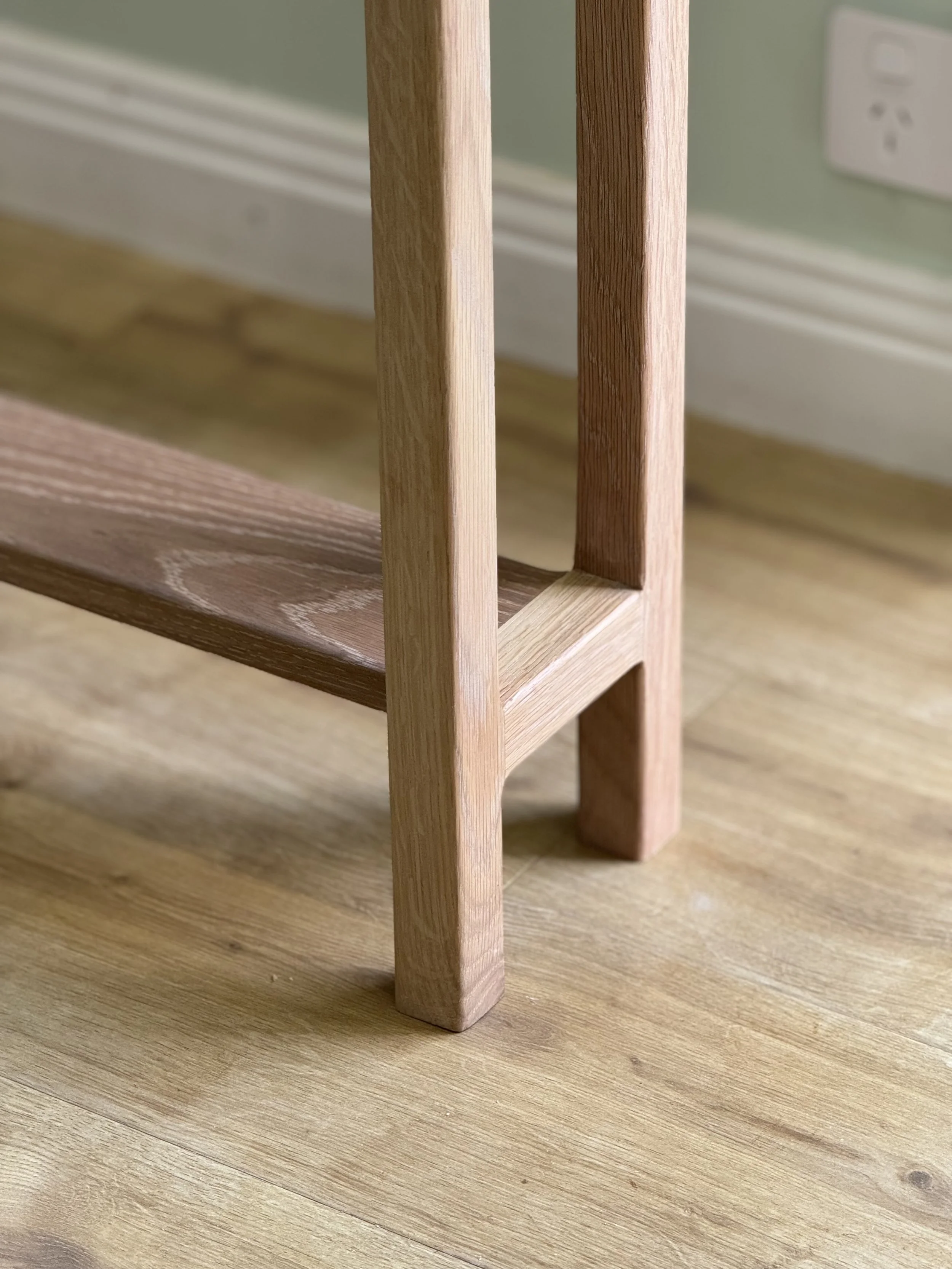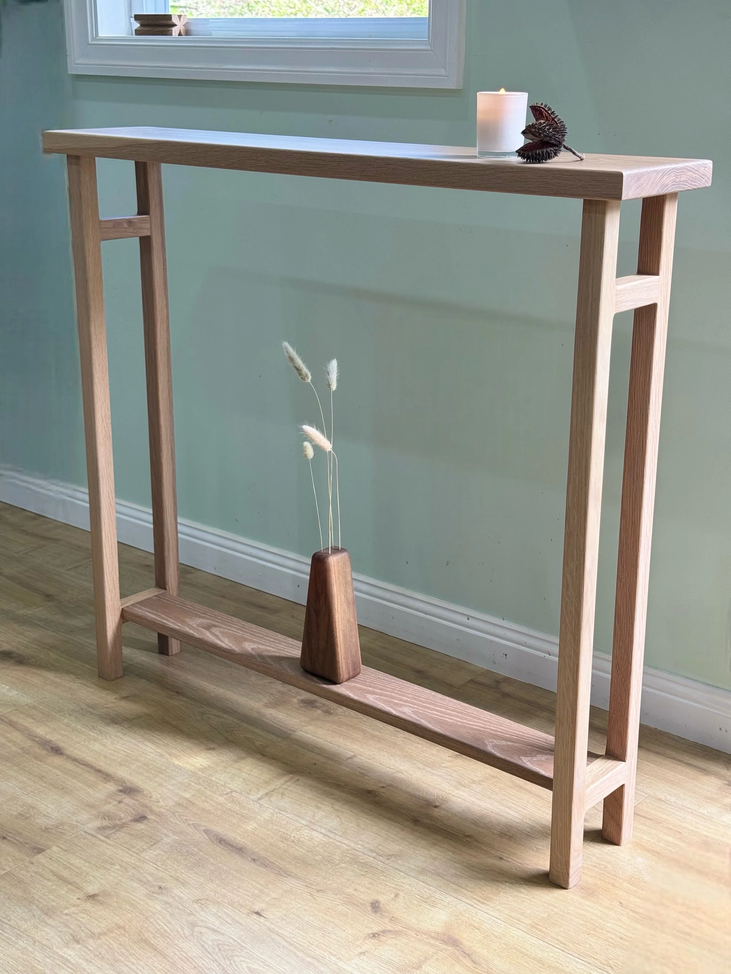 Made from American White Oak this elegant design has a minimalist shape and appeal. perfect for the hallway or under a window or painting. A second shelf below lends itself to a book or vase.